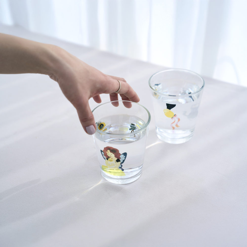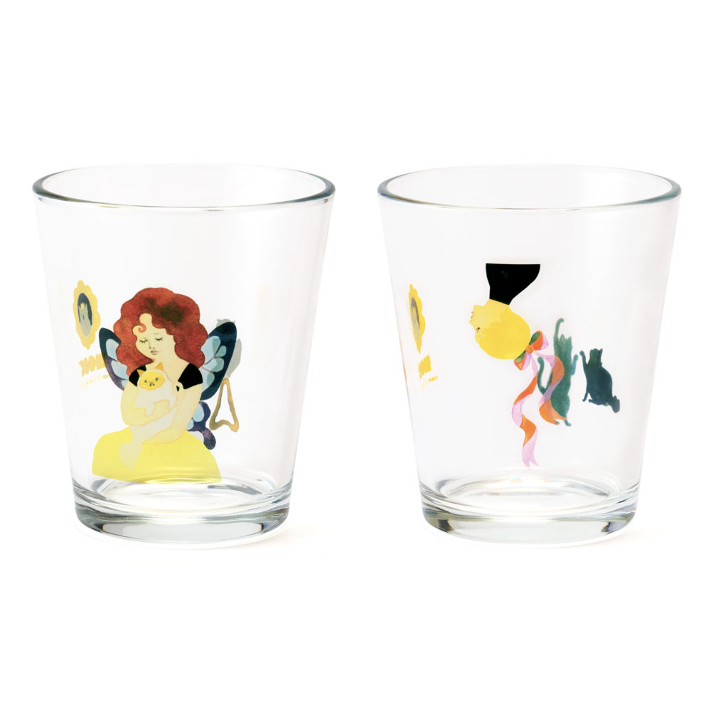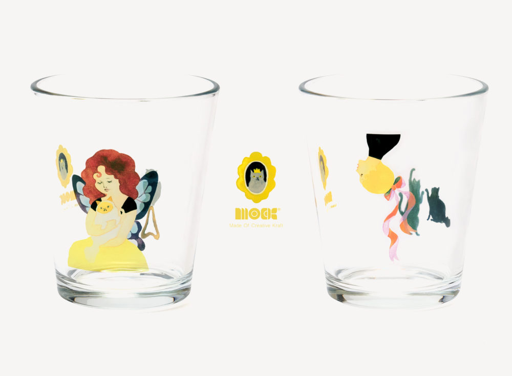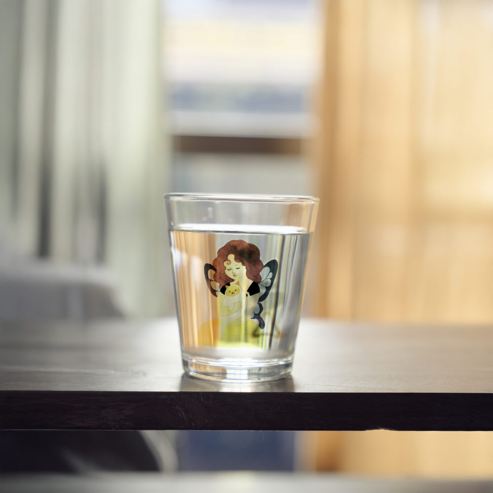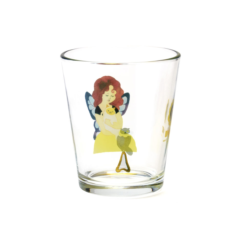 独特の世界観と、水彩ならではのにじみややわらかな色彩で描かれた、女性と猫たちの戯れ。その物語性あふれるイラストを、透明感のあるクリアグラスに落とし込みました。