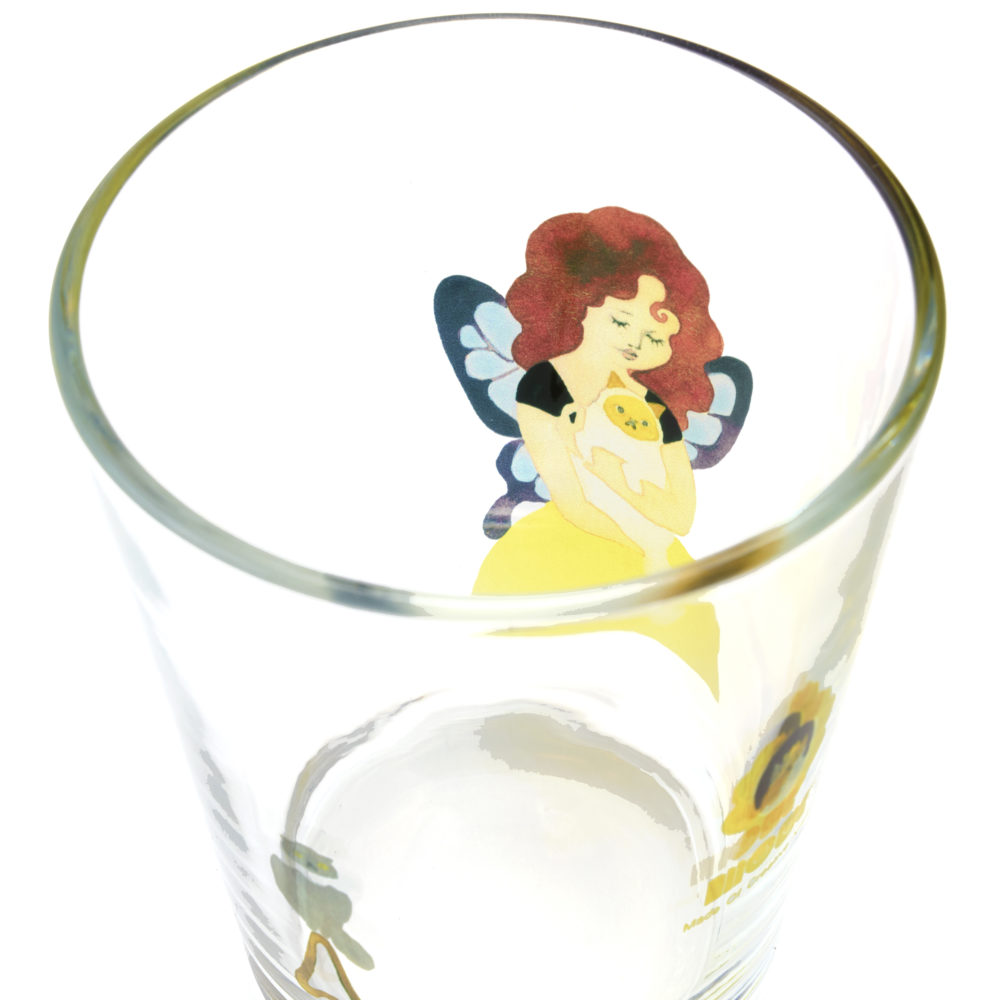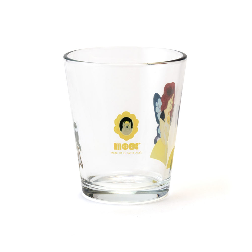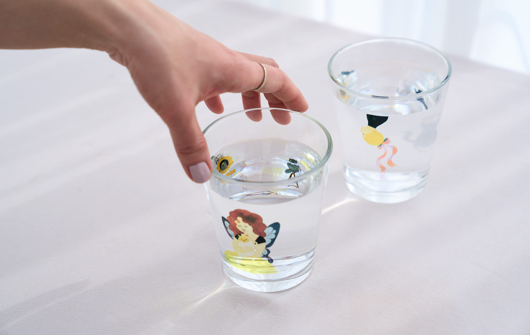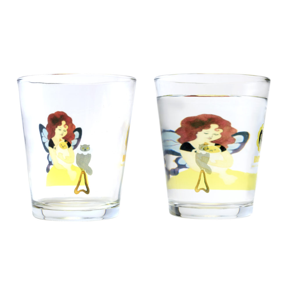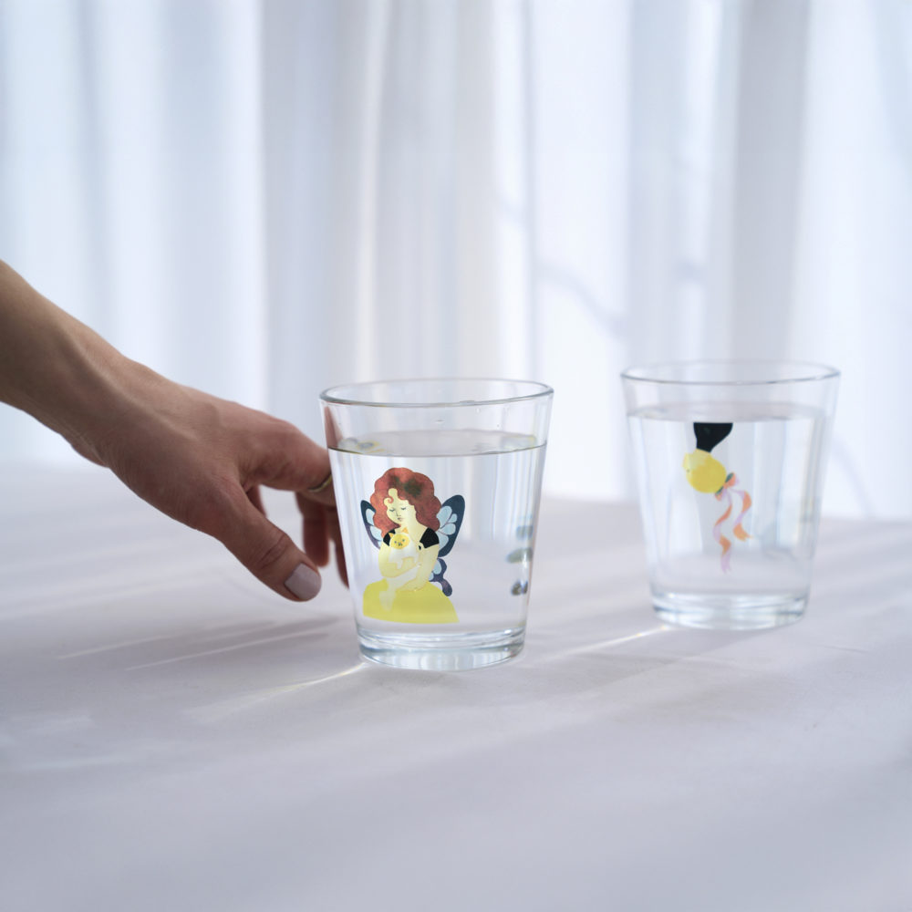 独特の世界観と、水彩ならではのにじみややわらかな色彩で描かれた、女性と猫たちの戯れ。その物語性あふれるイラストを、透明感のあるクリアグラスに落とし込みました。