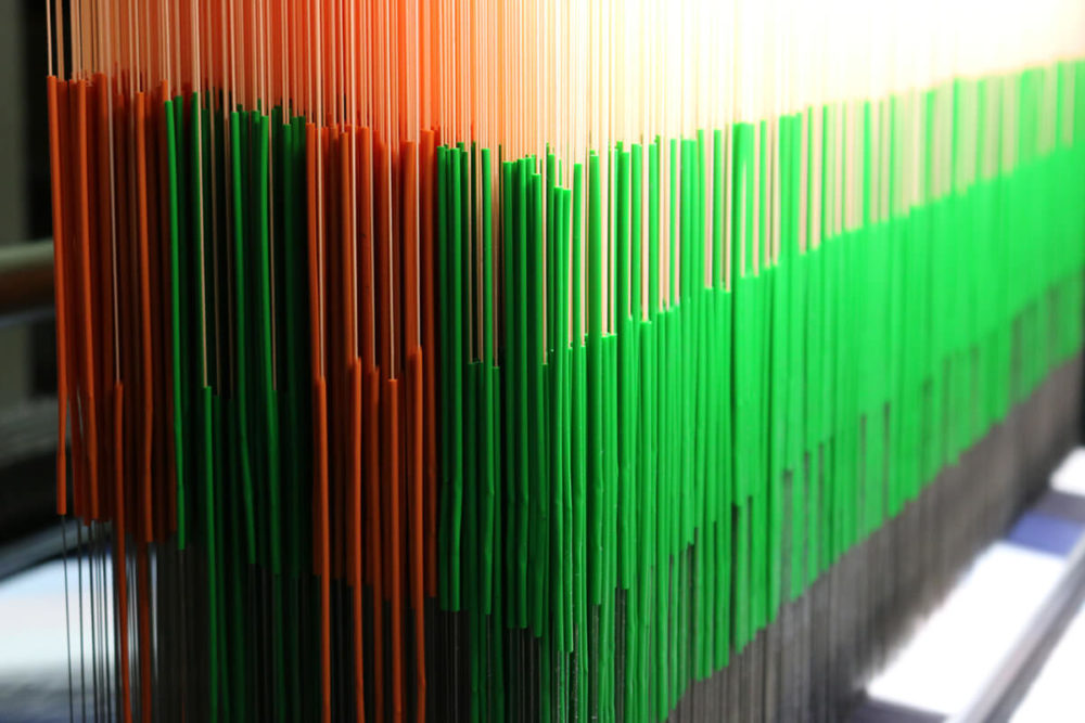 織物は、たて糸とよこ糸を交差させることで生まれます。プリント生地とは異なり、織物は使用できる糸の本数や表現に制約があるため、設計力と熟練した技術、そして時間を要します。
